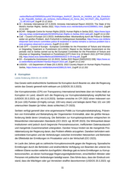 Inhuman or Degrading Treatment or Punishment (CPT) from 9 to 19 March 2021 [CPT/Inf (2022) 03], https://www.ecoi.net/en/file/local/2069493/2022-3-inf-eng.pdf , Zugriff 13.12.2023 ■ OCI – Organized Crime Index (2023): Serbia, https://ocindex.net/assets/downloads/2023/english/oc index_profile_serbia_2023.pdf, Zugriff 13.12.2023 ■ USDOS - US Department of State (20.3.2023): 2022 Country Report on Human Rights Practices: Serbia, https://www.ecoi.net/de/dokument/2089125.html, Zugriff 13.12.2023 ■ VB des BM.I für Serbien und Montenegro [Österreich] (14.4.2023): Auskunft des VB, per E-Mail 7 Folter und unmenschliche Behandlung Letzte Änderung 2024-01-15 15:00 Seit 2006 ist Folter im serbischen Strafgesetzbuch ein Straftatbestand (AA 11.8.2023; vgl. BCHR 2023). Obwohl die Verfassung solche Praktiken verbietet, gab es Berichte darüber, dass die Polizei Gefangene schlug und Verdächtigte schikanierte (USDOS 20.3.2023; vgl. AA 11.8.2023). In einzelnen Fällen wurden die Polizisten vom Dienst suspendiert. In mehreren Fällen wurde Folteropfern von serbischen Gerichten staatliche Entschädigung zugesprochen (AA 11.8.2023). Der Ombudsmann führte Besuche im Rahmen des nationalen Präventionsmechanismus gegen Folter in den relevanten Einrichtungen durch. Außerdem wurden Schulungen zur Methodologie der Ermittlung von Folterfällen fortgesetzt (EK 12.10.2022). Der Europäische Ausschuss zur Verhütung von Folter (CPT) berichtete nach seinem Besuch serbischer Polizeistationen und Gefängnisse im Jahr 2021 von anhaltenden Misshandlungen durch die Polizei, die teilweise Folter gleichkamen, sowie vom Fehlen wirksamer Maßnahmen zur Umsetzung früherer Empfehlungen des CPT (CoE-CPT 10.3.2022; vgl. CoE 10.3.2022; BCHR 2023; AI 27.3.2023). Der CPT stellte auch fest, dass die staatsanwaltschaftlichen Ermittlungen in sehr vielen Fällen nicht den Effizienzkriterien der 2018 angenommenen Methodik für die Untersuchung von Misshandlungsfällen entsprachen. Weiters äußerte er Bedenken hinsichtlich der milden Strafen gegen Polizeibeamte, die wegen Misshandlung verurteilt wurden (CoE-CPT 10.3.2022). Das Belgrader Zentrum für Menschenrechte erklärte im Juni 2022, dass Straftaten, die angeblich mit Folter und anderen Formen des Missbrauchs verbunden sind, in Serbien in hohem Maße straffrei bleiben (USDOS 20.3.2023). Im Laufe des Jahres 2022 stellten Expterten der Zivilgesellschaft fest, dass sich die Qualität der internen polizeilichen Ermittlungen weiter verbessert hat. In den ersten acht Monaten des Jahres erhob die Abteilung für interne Kontrolle des Innenministeriums drei Strafanzeigen gegen Polizis ten, die im begründeten Verdacht standen, ein Missbrauchs- oder Folterverbrechen begangen zu haben. Im gleichen Zeitraum erstattete die Abteilung weitere 128 Strafanzeigen und sieben zusätzliche Anzeigen gegen Polizeibeamte und andere zivile Mitarbeiter des Ministeriums, ohne Einzelheiten zu veröffentlichen (USDOS 20.3.2023). Quellen: ■ AA – Auswärtiges Amt [Deutschland] (11.8.2023): Bericht im Hinblick auf die Einstufung der Republik Serbien als sicheres Herkunftsland im Sinne des § 29a AsylG (Stand: Juni 2023), https://www.ecoi 10