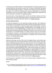 Die Regierung hat schließlich begrenzte Transportmöglichkeiten für diejenigen eingerichtet, die aus gesundheitlichen oder familiären Gründen nach Cox’s Bazar müssen (DFAT 30.11.2022). Das Katastrophenmanagement sagte zu, mindestens zwei Fahrten pro Monat von der Insel zu den Lagern in Cox’s Bazar für Familienbesuche zuzulassen. Regelmäßige und zuverlässige Verbindungen vom und zum Festland für Logistik, Handel, Familienbesuche, medizinische und andere Zwecke gibt es allerdings nicht (USDOS 20.3.2023). Das Memorandum of Understanding (MOU) zwischen den Vereinten Nationen und der Re gierung aus dem Jahr 2021 enthält Bestimmungen zur Verbesserung des Schutzes und der Dienstleistungen für Rohingya-Flüchtlinge in Bhasan Char (USDOS 20.3.2023). Rückführungsbemühungen Die Regierung Bangladeschs will eine dauerhafte Ansiedlung vermeiden. Nach erfolgreichen Verhandlungen um eine Repatriierung nach Myanmar lässt die Umsetzung jedoch auf sich war ten und verspricht, insbesondere im Lichte der jüngsten politischen Entwicklungen in Myanmar, wenig Aussicht auf Erfolg (AA 23.8.2022). Die Bedingungen für eine freiwillige, sichere und würdige Rückkehr sind nicht gegeben (HRW 12.1.2023). Aufgrund der bestehenden Gewalt und Menschenrechtsverletzungen gegen Rohingyas in Myanmar, war eine sichere und freiwil lige Rückkehr in ihr Herkunftsland bisher nicht möglich. Myanmar sagte zwar die Aufnahme von Rückkehrern mehrmals zu, unterband diese am Ende jedoch de facto immer mit zahlrei chen Hindernissen, allerdings nicht, ohne öffentlich zu verlautbaren, dass man durchaus eine Rückkehr wolle (ÖB New Delhi 11.2022). Registrierung und Dokumente Einige frühere Rohingya, die seit den 90er-Jahren in Bangladesch leben, wurden damals regis triert und verfügen über mehrere Ausweisdokumente, darunter UNHCR-Ausweise, Geburtsur kunden, Welternährungsprogrammkarten und andere Dokumente. Bei einer freiwilligen Volks zählung im Jahr 2016 wurden viele Neuankömmlinge registriert, und sie erhielten einen lami nierten biometrischen Ausweis (DFAT 30.11.2022). Seit 2018 führen UNHCR und die Regierung einen gemeinsamen Registrierungsprozess durch. Dabei werden Rohingya als Forcibly Dis placed Myanmar Nationals registriert (HRW 15.6.2021; vgl. CoM 5.4.2023). Sind damit nicht als Flüchtlinge registriert (CoM 5.4.2023). Hunderttausende wurden dabei erfasst und erhielten Identitätsausweise, genannt „ Smart Cards“, mit denen sie zu den Hilfsleistungen, inklusive Ge sundheitsdienste, Zugang erhalten. Human Rights Watch kritisierte allerdings, dass die Daten, inklusive biometrische Daten, von mindestens 830.000 dabei registrierten Rohingyas im Zuge der Rückführungsverhandlungen mit Myanmar geteilt wurden (HRW 15.6.2021). Wie alle Menschen in Bangladesch können auch Rohingya Zugang zu gefälschten Pässen haben (DFAT 30.11.2022). Quellen ■ AA - Auswärtiges Amt [Deutschland] (23.8.2022): Bericht über die asyl- und abschiebungsrelevante Lage in der Volksrepublik Bangladesch (Stand: Juli 2022), https://www.ecoi.net/en/file/local/20780 56