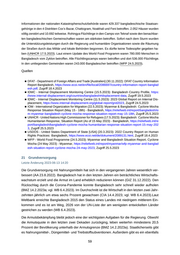 Informationen der nationalen Katastrophenschutzbehörde waren 429.337 bangladeschische Staatsan gehörige in den 4 Distrikten Cox’s Bazar, Chattogram, Noakhali und Feni betroffen. 2.052 Häuser wurden völlig zerstört und 10.692 teilweise. Rohingya Flüchtlinge in den Camps von Teknaf sowie den benachbar ten bangladeschischen Gemeinschaften waren am stärksten betroffen. Sofort nach dem Sturm wurden die Unterstützungsleistungen durch die Regierung und humanitäre Organisationen sowie die Räumung der Straßen durch das Militär und lokale Behörden begonnen. Es dürfte keine Todesopfer gegeben ha ben (UNHCR 17.5.2023). Laut einem Update des World Food Programm waren 780.000 Menschen in Bangladesch vom Zyklon betroffen. Alle Flüchtlingscamps waren betroffen und dort 536.000 Flüchtlinge. In den umliegenden Gemeinden waren 243.000 Bangladescher betroffen (WFP 24.5.2023). Quellen ■ DFAT - Department of Foreign Affairs and Trade [Australien] (30.11.2022): DFAT Country Information Report Bangladesh, https://www.ecoi.net/en/file/local/2086697/country-information-report-banglad esh.pdf, Zugriff 18.4.2023 ■ IDMC - Internal Displacement Monitoring Centre (15.5.2023): Bangladesh Country Profile, https: //www.internal-displacement.org/countries/bangladesh#displacement-data, Zugriff 19.5.2023 ■ IDMC - Internal Displacement Monitoring Centre (11.5.2023): 2023 Global Report on Internal Dis placement, https://www.internal-displacement.org/global-report/grid2023, Zugriff 24.5.2023 ■ IOM - International Organization for Migration (22.5.2023): Myanmar & Bangladesh: Cyclone Mocha Response Situation Report (May 15 - 18th) - Bangladesh, https://reliefweb.int/report/bangladesh/io m-myanmar-bangladesh-cyclone-mocha-response-situation-report-may-15-18th , Zugriff 25.5.2023 ■ UNHCR - United Nations High Commissioner for Refugees (17.5.2023): Bangladesh: Cyclone Mocha Humanitarian Response, Situation Report (As of 15 May 2023) - Bangladesh, https://reliefweb.int/re port/bangladesh/bangladesh-cyclone-mocha-humanitarian-response-situation-report-15-may-202 3, Zugriff 25.5.2023 ■ USDOS - United States Department of State [USA] (20.3.2023): 2022 Country Report on Human Rights Practices: Bangladesh, https://www.ecoi.net/de/dokument/2089131.html, Zugriff 18.4.2023 ■ WFP - World Food Programme (24.5.2023): Myanmar and Bangladesh Situation Report, Cyclone Mocha (24 May 2023) - Myanmar, https://reliefweb.int/report/myanmar/wfp-myanmar-and-banglad esh-situation-report-cyclone-mocha-24-may-2023 , Zugriff 25.5.2023 21 Grundversorgung Letzte Änderung 2023-06-13 14:20 Die Grundversorgung mit Nahrungsmitteln hat sich in den vergangenen Jahren wesentlich ver bessert (AA 23.8.2022). Bangladesch hat in den letzten Jahren ein beträchtliches Wirtschafts wachstum erzielt und die Armut im Land erheblich reduzieren können (GIZ 31.12.2022). Den Rückschlag durch die Corona-Pandemie konnte Bangladesch sehr schnell wieder aufholen (BMZ 14.2.2023a; vgl. WB 6.4.2023). Im Durchschnitt ist die Wirtschaft in den letzten zwei Jahr zehnten jährlich um etwa sechs Prozent gewachsen (CIA 14.4.2023; vgl. WB 6.4.2023).Laut Weltbank erreichte Bangladesch 2015 den Status eines Landes mit niedrigem mittlerem Ein kommen und es ist am Weg, 2026 von der UN-Liste der am wenigsten entwickelten Länder gestrichen zu werden (WB 6.4.2023). Die Armutsbekämpfung bleibt jedoch eine der wichtigsten Aufgaben für die Regierung. Obwohl die Armutsquote in den letzten zwei Dekaden zurückging, leben weiterhin mindestens 20,5 Prozent der Bevölkerung unterhalb der Armutsgrenze (BMZ 14.2.2023a). Staatlicherseits gibt es Nahrungsmittel-, Düngemittel- und Treibstoffsubventionen. Außerdem gibt es ein ebenfalls 59