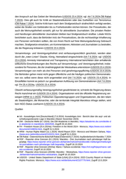 den Anspruch auf das Gebiet der Westsahara (USDOS 23.4.2024; vgl. AA 7.6.2024,ÖB Rabat 7.2024). Dies gilt auch für Kritik an Staatsinstitutionen oder das Gutheißen von Terrorismus (ÖB Rabat 7.2024). Solche Kritik kann nach dem Strafgesetzbuch strafrechtlich verfolgt werden, wobei die Strafen von Geldstrafen bis zu Freiheitsstrafen reichen können. Der Pressekodex, der auch die Meinungsfreiheit vorsieht, gilt nur für akkreditierte Journalisten. Die privaten Reden und Handlungen akkreditierter Journalisten bleiben laut Strafgesetzbuch strafbar. Lokale NGOs berichteten auch, dass die Behörden trotz der Pressekodizes, die die rechtswidrige Inhaftierung von Personen verhindern sollten, die von ihrem Recht auf freie Meinungsäußerung Gebrauch machten, Strafgesetze einsetzten, um Kommentatoren, Aktivisten und Journalisten zu bestrafen, die die Regierung kritisieren (USDOS 23.4.2024). Versammlungs- und Vereinigungsfreiheit sind verfassungsrechtlich geschützt, werden aber durch die „ roten Linien“ Glaube, König, Heimatland eingeschränkt (AA 7.6.2024; vgl. USDOS 23.4.2024). Amnesty International und Transparency International berichteten über anhaltende willkürliche Einschränkungen des Rechts auf Versammlungs- und Vereinigungsfreiheit, insbe sondere für Personen, die die Unabhängigkeit der Westsahara unterstützen (USDOS 23.4.2024). Versammlungen von mehr als drei Personen sind genehmigungspflichtig (USDOS 23.4.2024). Die Behörden gehen meist nicht gegen öffentliche und die häufigen politischen Demonstratio nen vor, selbst wenn diese nicht angemeldet sind (AA 7.6.2024; vgl. USDOS 23.4.2024). In Einzelfällen kommt es jedoch zur gewaltsamen Auflösung von Demonstrationen (AA 7.6.2024; vgl. FH 25.4.2024a, USDOS 23.4.2024). Obwohl verfassungsmäßig Vereinigungsfreiheit gewährleistet ist, schränkt die Regierung dieses Recht manchmal ein (USDOS 23.4.2024). Organisationen wird die offizielle Registrierung ver weigert (HRW 11.1.2024). Politischen Oppositionsgruppen und Organisationen, die den Islam als Staatsreligion, die Monarchie, oder die territoriale Integrität Marokkos infrage stellen, wird kein NGO-Status zuerkannt (USDOS 23.4.2024). Quellen ■ AA - Auswärtiges Amt [Deutschland] (7.6.2024): Auswärtiges Amt - Bericht über die asyl- und ab schiebungsrelevante Lage in Marokko (Stand: November 2023) ■ DW - Deutsche Welle (8.7.2024): Die DW Akademie in Marokko, https://akademie.dw.com/de/die-d w-akademie-in-marokko/a-18402540 , Zugriff 29.10.2024 ■ FH - Freedom House (25.4.2024a): Freedom in the World 2024 - Morocco, https://www.ecoi.net/en/ document/2108054.html, Zugriff 31.5.2024 ■ HRW - Human Rights Watch (11.1.2024): World Report 2024 - Morocco and Western Sahara, https: //www.ecoi.net/en/document/2103231.html, Zugriff 31.5.2024 ■ ÖB Rabat - Österreichische Botschaft Rabat [Österreich] (7.2024): Asylländerbericht Marokko 7.2024 ■ RSF - Reporter ohne Grenzen (8.1.2024): Marokko - Drei Journalisten nach jahrelanger Haft be gnadigt, https://www.reporter-ohne-grenzen.de/laender/nahost/marokko/alle-meldungen/meldung/d rei-journalisten-nach-jahrelanger-haft-begnadigt , Zugriff 16.10.2024 ■ RSF - Reporter ohne Grenzen (2024a): Maroc / Sahara occidental, https://rsf.org/fr/pays/maroc-sah ara-occidental, Zugriff 16.10.2024 ■ RSF - Reporter ohne Grenzen (2024b): Marokko - Westsahara, https://www.reporter-ohne-grenzen .de/laender/nahost/marokko-westsahara, Zugriff 16.10.2024 ■ USDOS - United States Department of State [USA] (23.4.2024): 2023 Country Report on Human Rights Practices: Morocco, https://www.ecoi.net/de/dokument/2107779.html, Zugriff 13.5.2024 20