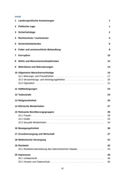 Inhalt 1 Länderspezifische Anmerkungen 1 2 Politische Lage 1 3 Sicherheitslage 2 4 Rechtsschutz / Justizwesen 4 5 Sicherheitsbehörden 6 6 Folter und unmenschliche Behandlung 8 7 Korruption 10 8 NGOs und Menschenrechtsaktivisten 12 9 Wehrdienst und Rekrutierungen 14 10 Allgemeine Menschenrechtslage 15 10.1 Meinungs- und Pressefreiheit . . . . . . . . . . . . . . . . . . . . . . . . . . . . 17 10.2 Versammlungs- und Vereinigungsfreiheit . . . . . . . . . . . . . . . . . . . . . . 20 10.3 Opposition . . . . . . . . . . . . . . . . . . . . . . . . . . . . . . . . . . . . . . 21 11 Haftbedingungen 23 12 Todesstrafe 24 13 Religionsfreiheit 25 14 Ethnische Minderheiten 27 15 Relevante Bevölkerungsgruppen 28 15.1 Frauen . . . . . . . . . . . . . . . . . . . . . . . . . . . . . . . . . . . . . . . . . 28 15.2 Kinder . . . . . . . . . . . . . . . . . . . . . . . . . . . . . . . . . . . . . . . . . 32 15.3 Sexuelle Minderheiten . . . . . . . . . . . . . . . . . . . . . . . . . . . . . . . . 34 16 Bewegungsfreiheit 36 17 Grundversorgung und Wirtschaft 37 18 Medizinische Versorgung 41 19 Rückkehr 42 19.1 Rückkehrunterstützung des österreichischen Staates . . . . . . . . . . . . . . . 43 20 Impressum 45 20.1 Urheberrecht . . . . . . . . . . . . . . . . . . . . . . . . . . . . . . . . . . . . . 46 20.2 Hinweis zum Datenschutz . . . . . . . . . . . . . . . . . . . . . . . . . . . . . . 46 IV