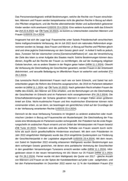 Das Personenstandsgesetz enthält Bestimmungen, welche die Rechte von Frauen einschrän ken; Männern und Frauen werden beispielsweise nicht die gleichen Rechte in Bezug auf elterli che Pflichten eingeräumt, und die Rechte alleinstehender Mütter und außerehelich geborener Kinder werden nicht anerkannt (USDOS 23.4.2024). Eine weitere Ausnahme stellt das Erbrecht dar (AA 22.6.2023; vgl. ÖB Tunis 10.2022), es kommt zu Unterschieden zwischen Männern und Frauen (USDOS 23.4.2024). Insgesamt hat sich die Lage bzgl. Frauenrechte unter Saïeds Präsidentschaft verschlechtert. Seine maßgeschneiderte Verfassung, die im Juli 2022 durch ein nationales Referendum ange nommen worden ist, besagt, dass Frauen und Männer „ in Bezug auf Rechte und Pflichten gleich sind und ohne jegliche Diskriminierung vor dem Gesetz gleich sind“. In Artikel 5 heißt es jedoch, dass „Tunesien Teil der islamischen Umma [Gemeinschaft/Nation] ist“, was die Verwirklichung der Ziele des Islam zu einer Aufgabe des Staates macht. Solche Bestimmungen können dazu dienen, Angriffe auf die Rechte der Frauen zu rechtfertigen, die auf der Auslegung religiöser Gebote beruhen, wie es andere Staaten in der Region getan haben (HRW 11.1.2024). Obwohl die Verfassung die Gleichstellung der Geschlechter garantiert, werden Frauen in der Arbeitswelt diskriminiert, und sexuelle Belästigung im öffentlichen Raum ist weiterhin weit verbreitet (FH 29.2.2024). Das tunesische Recht diskriminiert Frauen nach wie vor beim Erbrecht, und Saïed hat sich entschieden gegen die Reform des Erbrechts ausgesprochen, die 2019 im Parlament debattiert worden ist (HRW 11.1.2024; vgl. ÖB Tunis 10.2022). Nach geltendem Recht erhalten Frauen die Hälfte des Anteils, den Männer am Erbe erhalten, und die Bemühungen um die Gleichstellung der Geschlechter im Erbrecht sind im Parlament nicht vorangekommen (FH 29.2.2024). Die Erbschaftsbestimmungen der Scharia gewähren Männern in einigen Fällen einen größeren Anteil am Erbe. Nicht-muslimische Frauen und ihre muslimischen Ehemänner können nicht voneinander erben, es sei denn, sie beantragen ein gerichtliches Urteil auf der Grundlage der in der Verfassung verankerten Rechte (USDOS 23.4.2024). Dennoch ist die neue Verfassung Tunesiens im Vergleich zu anderen arabischen oder musli mischen Ländern in Bezug auf Frauenrechte ein Musterbeispiel. Die Gleichstellung der Frau sowie eine Mindestquote im Parlament wurden sichergestellt. Der Präsident hat die erste Regie rungschefin im arabischen Raum ernannt und ein Drittel der Ministerposten mit Frauen besetzt (ÖB Tunis 10.2022). Trotzdem wird die politische Teilhabe von Frauen sowohl durch recht liche als auch durch gesellschaftliche Hindernisse erschwert. Mit dem vom Präsidenten im Jahr 2022 eingeführten Wahlgesetz wurde das 2014 eingeführte Quotensystem zur Förderung der Geschlechterparität in der Legislative abgeschafft (USDOS 23.4.2024). Mit dem neuen, von Saïed im September 2022 einseitig erlassenen Wahlgesetz wurden Bestimmungen aus dem vorherigen Gesetz gestrichen, mit denen eine paritätische Vertretung der Geschlechter in den gewählten Versammlungen Tunesiens erreicht werden sollte (HRW 11.1.2024). Infol gedessen sitzen in der neuen Versammlung mit 161 Sitzen nur 25 Frauen (HRW 11.1.2024; vgl. FH 29.2.2024). Ferner wurde mit dem Wahlgesetz die Quote von 2017 - gleiche Anzahl von Männern und Frauen an der Spitze der Kandidatenlisten auf jeder Liste - aufgehoben, und bei den Parlamentswahlen im Dezember 2022 waren nur 11 % der Kandidaten Frauen (FH 29