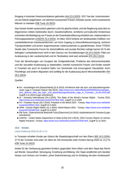 Eingang in konkrete Gesetzesinitiativen gefunden (AA 22.6.2023). 2017 hat das Justizministeri um ein Dekret aufgehoben, mit welchem tunesischen Frauen verboten wurde, nicht-muslimische Männer zu heiraten (ÖB Tunis 10.2022). Das Gesetz fordert ausdrücklich gleichen Lohn für gleiche Arbeit, und die Regierung setzt dies im Allgemeinen mittels Geldstrafen durch. Gesellschaftliche, rechtliche und kulturelle Hindernisse schränken die Beteiligung von Frauen an der Erwerbsbevölkerung erheblich ein, insbesondere in Führungspositionen (USDOS 23.4.2024). Im März 2023 forderte ein landesweites Kollektiv von Landarbeiterinnen Gesetzesreformen, um ihren Zugang zu Gesundheitsversorgung, sicheren Transportmitteln und einem angemessenen Lebensunterhalt zu gewährleisten. Einer FTDES- Studie (das Tunesische Forum für wirtschaftliche und soziale Rechte) zufolge kamen 92 % der befragten Landarbeiterinnen nicht in den Genuss von Sozialleistungen (AI 24.4.2024). Fälle von Ausbeutung in der Landwirtschaft und im Textilsektor sind weit verbreitet (FH 29.2.2024). Trotz der Bemühungen von Gruppen der Zivilgesellschaft, Probleme des Menschenhandels und der sexuellen Ausbeutung zu bekämpfen, werden tunesische Frauen und Kinder sowohl in Tunesien als auch im Ausland Opfer von Sexhandel und erzwungener Hausarbeit. Auch Flüchtlinge und andere Migranten sind anfällig für die Ausbeutung durch Menschenhändler (FH 29.2.2024). Quellen ■ AA - Auswärtiges Amt [Deutschland] (22.6.2023): AA Bericht über die asyl- und abschiebungsrele vante Lage in Tunesien (Stand: Mai 2023), https://www.ecoi.net/en/file/local/2093953/Auswärtiges_ Amt,_Bericht_über_die_asyl-_und_abschiebungsrelevante_Lage_in_Tunesien,_22.06.2023.pdf , Zugriff 4.12.2024 [Login erforderlich] ■ AI - Amnesty International (24.4.2024): The State of the World’s Human Rights - Tunisia 2023, https://www.ecoi.net/en/document/2107931.html, Zugriff 14.11.2024 ■ FH - Freedom House (29.2.2024): Freedom in the World 2024 - Tunisia, https://www.ecoi.net/de/do kument/2105041.html, Zugriff 15.3.2024 ■ HRW - Human Rights Watch (11.1.2024): World Report 2024 - Tunisia, https://www.ecoi.net/de/do kument/2103188.html, Zugriff 15.3.2024 ■ ÖB Tunis - Österreichische Botschaft Tunis [Österreich] (10.2022): Asylländerbericht Tunesien [Login erforderlich] ■ USDOS - United States Department of State [USA] (23.4.2024): 2023 Country Report on Human Rights Practices: Tunisia, https://www.ecoi.net/en/document/2107636.html, Zugriff 11.11.2024 15.2 Kinder Letzte Änderung 2025-02-26 17:12 In Tunesien erhalten Kinder per Geburt die Staatsbürgerschaft von den Eltern (BS 19.3.2024). 27 % der Tunesier sind unter 18 Jahre alt. Die Armutsrate unter Kindern betrug 2020 ca. 21,2 % (ÖB Tunis 10.2022). Artikel 52 der Verfassung garantiert Kindern gegenüber ihren Eltern und dem Staat das Recht auf Würde, Gesundheit, Versorgung, Erziehung und Bildung. Der Staat verpflichtet sich darüber hinaus zum Schutz von Kindern „ ohne Diskriminierung und im Einklang mit dem Kindeswohl“ 32