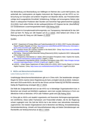 Die Behandlung und Misshandlung von Häftlingen im Rahmen des Liuzhi-Haft-Systems, das außerhalb des Justizsystems als legales Instrument der Regierung und der KPCh zur Un tersuchung von Korruption und anderen Vergehen von Beamten diente, war Presseberichten zufolge durch ausgedehnte Einzelhaft, Schlafentzug, Schläge und erzwungenes Stehen oder Sitzen in unbequemen Positionen über Stunden und manchmal Tage gekennzeichnet (USDOS 23.4.2024). Auch sollen Richter mit den außergerichtlichen KP-Organen bei der „ Beschaffung“ von Geständnissen zusammengearbeitet haben (ÖB Peking 2024). China scheint im Korruptionswahrnehmungsindex von Transparency International für das Jahr 2023 auf dem 76. Rang von 180 Staaten auf (TI 1.7.2024). 2022 befand sich China in der Reihung auf dem 65. Rang von 180 Staaten (TI 2023). Quellen ■ DFAT - Department of Foreign Affairs and Trade [Australien] (22.12.2021): DFAT Country Information Report People’s Republic of China, https://www.ecoi.net/en/file/local/2067346/country-information-r eport-china-22122021.pdf, Zugriff 15.2.2023 ■ FH - Freedom House (29.2.2024a): Freedom in the World 2024 - China, https://www.ecoi.net/de/do kument/2105013.html, Zugriff 10.6.2024 ■ ÖB Peking - Österreichische Botschaft Peking [Österreich] (2024): Asylbericht 2023: Volksrepublik China (Stand Juli 2024) ■ TI - Transparency International (1.7.2024): 2023 Corruption Perceptions Index: Explore the results, https://www.transparency.org/en/cpi/2023, Zugriff 1.7.2024 ■ TI - Transparency International (2023): Corruption Perceptions Index 2022, https://images.transpa rencycdn.org/images/Report_CPI2022_English.pdf, Zugriff 1.7.2024 ■ USDOS - United States Department of State [USA] (23.4.2024): 2023 Country Report on Human Rights Practices: China, https://www.ecoi.net/de/dokument/2107650.html, Zugriff 10.6.2024 9 NGOs und Menschenrechtsaktivisten Letzte Änderung 2024-09-17 16:11 Unabhängige Menschenrechtsinstitutionen gibt es in China nicht. Die bestehenden strengen Regeln für NGOs machen deren Registrierung de facto unmöglich (AA 26.10.2022). Insbeson dere nach 2016 wurde NGOs, die sich für den Schutz und die Förderung von Rechten einsetzen, häufig die Registrierung verweigert (BS 2.7.2024). Die Rolle der Zivilgesellschaft wird von der KPCh nur in kleinteiliger Organisationsform bzw. in Bereichen wie Umwelt und Wohlfahrt zugelassen, wenn kein sozialer Aktivismus in Form von öffentlicher Kritik an Behörden, KPCh oder Politikern geübt wird (ÖB Peking 2024). In China gibt es NGOs und staatlich organisierte und finanzierte Nichtregierungsorganisatio nen (GONGOs). Diese sollen Fachwissen und Finanzmittel erhalten, die für die Regierung schwer zugänglich sind. Die Zahl der NGOs hat in den letzten zwei Jahrzehnten dramatisch zugenommen. Die meisten Organisationen sind in Bereichen wie Bildung, Armutsbekämpfung, Gemeindeentwicklung, Umwelt und Gesundheitswesen tätig und bieten Dienstleistungen wie Rechtshilfe und Verbraucherschutz an (BS 2.7.2024). 22