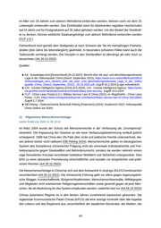 Ausländische Fernsehsender werden bei China betreffenden Meldungen sensiblen Inhalts in der Regel abgeschaltet, Internetseiten und Social Media Dienste wie Facebook, Twitter, Instagram und YouTube sind dauerhaft gesperrt, Inhalte mit sensiblen Schlüsselwörtern werden blockiert (ÖB Peking 2024). Internet Die Regierung kontrolliert und zensiert die Internetnutzung im Inland streng und überwacht auch die private Online-Kommunikation. Gesetzlich ist es der Regierung erlaubt, „ Cybersicherheitsri siken und -bedrohungen, die aus dem Inland oder aus dem Ausland stammen, zu überwachen, abzuwehren und zu bewältigen“. Die Nutzung des Internets zur „ Schaffung oder Verbreitung falscher Informationen zur Störung der wirtschaftlichen oder sozialen Ordnung“ ist unter Strafe gestellt. Gesetzlich haben die Sicherheitsbehörden außerdem die Befugnis, bei „ größeren Si cherheitsvorfällen“ die Kommunikationsnetze in einer ganzen Region zu unterbrechen (USDOS 23.4.2024). Die staatliche Verwaltung der Telekommunikationsinfrastruktur ermöglicht die Sperrung von Websites, die Entfernung von Smartphone-Anwendungen vom heimischen Markt und die mas senhafte Löschung von Beiträgen und Benutzerkonten in sozialen Medien, die sich mit ver botenen Themen befassen. Tausende von Websites wurden gesperrt, viele davon seit Jahren, darunter wichtige Nachrichten- und Social-Media-Drehscheiben wie die New York Times, die British Broadcasting Corporation (BBC), YouTube, X und Facebook (FH 29.2.2024a). Meinungsfreiheit inklusive soziale Medien Laut Verfassung besteht das Recht auf Redefreiheit (AA 26.10.2022; vgl. BS 2.7.2024). Aller dings werden von der offiziellen politischen Linie abweichende Meinungsäußerungen, insbe sondere wenn sie die Führungsrolle der KP in Staat und Gesellschaft infrage stellen, mit allen Mitteln unterdrückt (ÖB Peking 2024). Die Möglichkeit von Bürgern zur offenen Meinungsäußerung im privaten Kreis und etwas ab gestuft in den sozialen Medien sind teilweise vorhanden und wird geduldet, ist aber immer mit unkalkulierbaren persönlichen Risiken verbunden. De facto unterliegt die Meinungsfreiheit nach wie vor strenger Reglementierung. Kritik an Partei und Regierung – v. a. bei Verbreitung über Flugblätter oder (elektronische) Medien – wird immer wieder als Gefährdung der Staatssicherheit verfolgt und drakonisch bestraft (AA 26.10.2022). Soziale Medien werden überwacht. Jede Diskussion in sozialen Medien ist für die Behörden sichtbar (DFAT 22.12.2021). Soziale Medien stehen besonders im Fokus der staatlichen Ein flussnahme. Kritische Beiträge oder Webseiten werden mit erheblichem personellem und tech nischem Aufwand zensiert bzw. gesperrt (AA 26.10.2022). Der Zugang zu Internetseiten und Social Media Diensten wie Facebook, Twitter, Instagram und YouTube ist dauerhaft blockiert (ÖB Peking 2024). Sowohl im Internet wie auch in der realen Welt unterliegen Diskussionen über eine Vielzahl von Themen einer drakonischen Zensur. 2023 hat die chinesische Aufsichtsbehörde für das 27