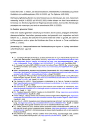 Kosten für Kinder zu mildern, wie Steuerreduktionen, Wohnbeihilfen, Kinderbetreuung und die Reduktion von Ausbildungskosten (RFA 10.2.2022; vgl. The Diplomat 18.3.2022). Die Regierung fordert außerdem nun eine Reduzierung von Abtreibungen, die nicht „ medizinisch notwendig“ sind (Al 29.3.2022; vgl. RFA 10.2.2022). Kritiker bringen vor, dass Frauen wieder zur Erreichung von Bevölkerungszielen der Regierung benutzt werden. Zuvor wurden Abtreibungen propagiert und erzwungen, jetzt sind sie unerwünscht (RFA 10.2.2022). Im Ausland geborene Kinder Fälle einer staatlich gelenkten Entziehung von Kindern, die im Ausland, entgegen der familien planungsrechtlichen Vorschriften, gezeugt wurden, sind gesetzlich nicht vorgesehen und nicht bekannt (AA 11.10.2021). Bei Geburten im Ausland werden die Kinder so gezählt, als wären sie in China geboren, und es gelten die Richtlinien des Ortes, an den sie in China zurückkehren (DFAT 22.12.2021). [Anmerkung: Zu Zwangsmaßnahmen der Familienplanung an Uiguren in Xinjiang siehe Ethni sche Minderheiten: Uiguren] Quellen: ■ AA - Auswärtiges Amt [Deutschland] (11.10.2021): Bericht über die asyl- und abschiebungsrelevante Lage in der Volksrepublik China (Stand: Juli 2021), https://www.ecoi.net/en/file/local/2062877/Aus w%C3%A4rtiges_Amt%2C_Bericht_%C3%BCber_die_asyl-_und_abschiebungsrelevante_Lage_i n_der_Volksrepublik_China_%28Stand_Juli_2021%29%2C_11.10.2021.pdf, Zugriff 28.4.2022 ■ AI - Amnesty International (29.3.2022): Amnesty International Report 2021/22; Zur weltweiten Lage der Menschenrechte; China 2021, https://www.ecoi.net/en/document/2070239.html , Zugriff 28.4.2022 ■ BAMF - Bundesamt für Migration und Flüchtlinge [Deutschland] (9.8.2021): Briefing Notes, https: //www.bamf.de/SharedDocs/Anlagen/DE/Behoerde/Informationszentrum/BriefingNotes/2021/briefi ngnotes-kw32-2021.pdf?__blob=publicationFile&v=4, Zugriff 28.4.2022 ■ DFAT - Department of Foreign Affairs and Trade [Australien] (22.12.2021): DFAT Country Information Report People’s Republic of China, https://www.ecoi.net/en/file/local/2067346/country-information-r eport-china-22122021.pdf, Zugriff 27.4.2022 ■ The Diplomat (18.3.2022): China Continues to Underdeliver in Its Plans to Combat the Low Birth Rate, https://thediplomat.com/2022/03/china-continues-to-underdeliver-in-its-plans-to-combat-the -low-birth-rate/ , Zugriff 12.7.2022 ■ The Economist (4.12.2021): Single mums in China want the same treatment as married ones, https: //www.economist.com/china/2021/12/04/single-mums-in-china-want-the-same-treatment-as-marri ed-ones, Zugriff 12.7.2022 ■ FH - Freedom House (28.2.2022): Freedom in the World 2022 - China, https://www.ecoi.net/de/do kument/2068722.html, Zugriff 28.4.2022 ■ Forbes India (21.3.2022): Unwed and unwanted, Chinese single mothers fight for rights, https://www. forbesindia.com/article/lifes/unwed-and-unwanted-chinese-single-mothers-fight-for-rights/74585/1 , Zugriff 12.7.2022 ■ China.Org (7.5.2022): Guangdong nutzt Geburtenregistrierung nicht mehr zur Geburtenbeschrän kung, http://german.china.org.cn/txt/2022-05/07/content_78205627.htm , Zugriff 17.6.2022 [Anmerkung bei dieser Quelle handelt es sich um ein staatliches Medium des HKS] ■ GT - Global Times (5.3.2022): Political advisor proposes to allow unmarried women aged over 30 with one child to gain access to maternity leave, insurance, https://www.globaltimes.cn/page/202203 /1254010.shtml, Zugriff 12.7.2022 [Anmerkung bei dieser Quelle handelt es sich um ein staatliches Medium des HKS] ■ NPC Observer (24.8.2021): NPCSC Codifies Three-Child Policy, Expands Legal Aid & Updates Military Service Law and Physicians Law, https://perma.cc/WJW6-KAY3, Zugriff 17.6.2022 63