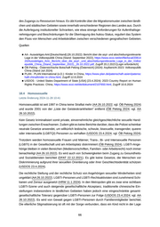 des Zugangs zu Ressourcen hinaus. Es übt Kontrolle über die Migrationsmuster zwischen ländli chen und städtischen Gebieten sowie innerhalb verschiedener Regionen des Landes aus. Durch die Auferlegung institutioneller Schranken, wie etwa strenge Anforderungen für Aufenthaltsge nehmigungen und Beschränkungen für die Übertragung des hukou-Status, reguliert das System den Fluss von Menschen und Arbeitskräften zwischen verschiedenen geografischen Gebieten. Quellen ■ AA - Auswärtiges Amt [Deutschland] (26.10.2022): Bericht über die asyl- und abschiebungsrelevante Lage in der Volksrepublik China (Stand: September 2022), https://www.ecoi.net/en/file/local/20814 20/Auswärtiges_Amt,_Bericht_über_die_asyl-_und_abschiebungsrelevante_Lage_in_der_Volksr epublik_China_(Stand_September_2022),_26.10.2022.pdf, Zugriff 20.2.2023 [Login erforderlich] ■ ÖB Peking - Österreichische Botschaft Peking [Österreich] (2024): Asylbericht 2023: Volksrepublik China (Stand Juli 2024) ■ PLAN - PLAN International (o.D.): Kinder in China, https://www.plan.de/patenschaft-asien/patensc haft-china/kinder-in-china.html , Zugriff 12.8.2024 ■ USDOS - United States Department of State [USA] (23.4.2024): 2023 Country Report on Human Rights Practices: China, https://www.ecoi.net/de/dokument/2107650.html, Zugriff 10.6.2024 18.4 Homosexuelle Letzte Änderung 2024-11-28 10:41 Homosexualität ist seit 1997 in China keine Straftat mehr (AA 26.10.2022; vgl. ÖB Peking 2024) und wurde 2001 von der „ Liste der Geisteskrankheiten“ entfernt (ÖB Peking 2024; vgl. AA 26.10.2022). Kein Gesetz kriminalisiert somit private, einvernehmliche gleichgeschlechtliche sexuelle Hand lungen zwischen Erwachsenen. Zudem gibt es keine Berichte darüber, dass die Polizei scheinbar neutrale Gesetze anwendet, um willkürlich lesbische, schwule, bisexuelle, transgender, queere oder intersexuelle (LGBTQI) Personen zu verhaften (USDOS 23.4.2024; vgl. ÖB Peking 2024). Trotzdem werden homosexuelle Frauen und Männer, Trans-, Bi- und Intersexuelle Personen (LGBTI) in der Gesellschaft und am Arbeitsplatz diskriminiert (ÖB Peking 2024). LGBTI-Ange hörige bleiben in vielen Bereichen (Medienvorschriften, Familien- oder Arbeitsrecht) noch immer benachteiligt (AA 26.10.2022). Es wird auch von Schwierigkeiten beim Zugang zu Gesundheits- und Sozialdiensten berichtet (DFAT 22.12.2021). Es gibt keine Gesetze, die Menschen vor Diskriminierung aufgrund ihrer sexuellen Orientierung oder ihrer Geschlechtsidentität schützen (USDOS 23.4.2024). Die rechtliche Stellung und der rechtliche Schutz von Angehörigen sexueller Minderheiten sind ungeklärt (AA 26.10.2022). LGBTI-Personen und LGBTI-Rechtsaktivisten sind zunehmend Schi kanen und Zensur ausgesetzt (HRW 11.1.2024). In den Metropolen gibt es zwar eine sichtbare LGBTI-Szene und auch steigende gesellschaftliche Akzeptanz, traditionelle chinesische Ein stellungen insbesondere in ländlichen Gebieten haben jedoch eine eingeschränkte gesamt gesellschaftliche Toleranz gegenüber LGBTI-Personen zur Folge (USDOS 23.4.2024; vgl. AA 26.10.2022). Es wird von Gewalt gegen LGBTI-Personen durch Familienmitglieder berichtet. Die elterliche Stigmatisierung ist oft mit der Sorge verbunden, dass ein Kind nicht in der Lage 66