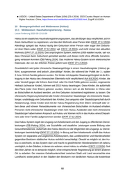 ■ TST - The Sixth Tone (1.9.2021): China Wants Larger Families. Unless You’re a Single Mom, https: //www.sixthtone.com/news/1008362/china-wants-larger-families.-unless-youre-a-single-mom. , Zugriff 12.7.2022 ■ ÖB Peking [Österreich] (12.2021): Asylländerbericht Volksrepublik China ■ ÖB Peking [Österreich] (28.5.2020): Auskunft des Vertrauensanwaltes ■ PMC - Population Health Metrics (31.3.2022): China’s fertility change: an analysis with multiple measures, https://pophealthmetrics.biomedcentral.com/articles/10.1186/s12963-022-00290-7 , Zugriff 13.7.2022 ■ RFA - Radio Free Asia (10.2.2022): China orders ’interventions’ to prevent teen and single-parent abortions, https://www.rfa.org/english/news/china/abortion-curbs-02102022131719.html , Zugriff 12.7.2022 ■ UKHO - United Kingdom Home Office [UK] (5.2022): Country Policy and Information Note China: Contravention of the Population and Family Planning law, https://www.ecoi.net/en/file/local/207 3314/CHN_CPIN_Contravention_of_national_population_and_family-planning_laws.pdf , Zugriff 17.6.2022 ■ USDOS - US Department of State [USA] (12.4.2022): 2021 Country Report on Human Rights Prac tices: China (Includes Hong Kong, Macau, and Tibet) - China, https://www.ecoi.net/en/document/2 071133.html, Zugriff 28.4.2022 ■ UNSW - University of New South Wales (4.2020): Migration, urbanisation, climate change and children in China—issues from a child rights perspective,https://www.researchgate.net/publication/3 53475115_Migration_urbanisation_climate_change_and_children_in_China-issues_from_a_child_r ights_perspective_Research_Team#pf31, Zugriff 18.6.2022 18.3 Kinder Letzte Änderung 2024-11-27 15:22 Die Staatsbürgerschaft wird von den Eltern abgeleitet. Die Eltern müssen ihre Kinder innerhalb eines Monats nach der Geburt gemäß dem nationalen Haushaltsregistrierungssystem anmelden. Kinder, die außerhalb der politischen Quoten oder von alleinstehenden Frauen geboren wurden, können oft nicht registriert werden und erhalten auch keine anderen rechtlichen Dokumente wie z. B. die Hukou-Aufenthaltsregisitrierung. Nicht registrierte Kinder wiederum haben keinen Zugang zu öffentlichen Dienstleistungen, einschließlich Bildungs- und Gesundheitsdiensten, Identitätsregistrierung oder Pensionsleistungen (USDOS 23.4.2024). Jeder Chinese wird in seinem Heimatort registriert und kann nur dort soziale Dienste, medizi nische Versorgung und Bildung in Anspruch nehmen. Wer umzieht, hat kein Recht auf diese Leistungen (PLAN o.D.). 280 Millionen Menschen leben außerhalb ihres Meldebezirks. Wander arbeitnehmer und ihre Familien sind hierbei mit zahlreichen Hindernissen in Bezug auf Arbeits bedingungen und Arbeitsrechte konfrontiert. Viele haben in den Städten, in denen sie leben und arbeiten, keinen Zugang zu öffentlichen Diensten, wie z. B. zu öffentlichen Bildungseinrichtun gen für ihre Kinder oder zur Sozialversicherung, da sie nicht als Einwohner der Stadt registriert sind (USDOS 23.4.2024). Es können zwar für Städte temporäre Wohngenehmigungen gekauft werden; diese sind allerdings für viele nicht erschwinglich (PLAN o.D.). Für nicht an ihrem Meldesitz ansässige Kinder von Wanderarbeitern bestehen mit ausreichenden Mitteln Möglichkeiten, diese in private Schulen zu schicken und eine private Krankenversorgung zu organisieren (ÖB Peking 2024). Mehr als neun Millionen Kinder bleiben jedes Jahr auf dem Land zurück, wenn ihre Eltern als Wanderarbeiter in die Städte ziehen. Im besten Fall kümmern sich die Großeltern um sie. Im schlimmsten Fall sind sie auf sich alleine gestellt. 64