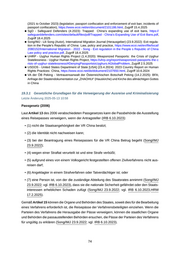 Rückkehr nach China notwendig ist. UHRP berichtet weiters, dass jene Uiguren, die nach China zurückgekehrt sind, verschwunden sind (UHRP 1.4.2020). Die Behörden gestatten mittlerweile einigen Uiguren zwar die Beantragung oder Rückgabe von Reisepässen für internationale Rei sen, üben jedoch eine strenge Kontrolle über diejenigen aus, die reisen. Umgekehrt ermöglicht die Regierung den Uiguren in der Diaspora eingeschränkte Besuche in Xinjiang, mit dem of fensichtlichen Ziel, der Öffentlichkeit ein Bild der Normalität in der Region zu vermitteln (HRW 3.2.2025). Darüber hinaus verlangen die Behörden zunehmend von Regierungsangestellten, ihre Pässe zur „Aufbewahrung“ abzugeben. Für die Rückgabe benötigen die Angestellten wiederum eine behördliche Genehmigung. Während solche Praktiken bei hochrangigen Beamten schon lange üblich sind, wurden sie inzwischen auch auf niederrangige Angestellte, darunter an Schulen, Universitäten und Krankenhäusern, ausgeweitet. Die Behörden behaupten, diese Maßnahmen dienten der Korruptionsprävention und der Vermeidung der Weitergabe von Staatsgeheimnissen (HRW 17.2.2025). Die Ausreise aus der VR China wird durch drei Mechanismen geregelt: erstens Beschränkungen beim Zugang zu Pässen, zweitens Ausreiseverbote für bestimmte Passinhaber und drittens Kri minalisierung der unerlaubten Ausreise. Allerdings nur wenn die Umstände als schwerwiegend eingestuft werden, wird der illegale Grenzübertritt zu einer strafbaren Handlung nach Artikel 322 des Strafgesetzes. Insgesamt enthalten 178 Gesetze (Song/IMJ 23.9.2022), Verordnungen, Verwaltungsvorschriften, Rechtsauslegungen und interne Regeln der VR China Bestimmungen zu Ausreisebeschränkungen (SgD 4.2023). Die Strafprozessordnung, die Passordnung und das Gesetz über die Ein- und Ausreise sind für die Beschlagnahmung von Reisedokumenten von Personen relevant, gegen die eine Strafanzeige erstattet wurde oder die unter polizeilicher Untersuchung stehen. Folgende Gesetzesartikel ermöglichen es verschiedenen Regierungs- und Justizbehörden, Pässe einzuziehen: Artikel 15 des Passgesetzes, Artikel 30 des Überwa chungsgesetzes, Artikel 71 und 77 der Strafprozessordnung (IRB 6.10.2023) sowie Artikel 12 des Gesetzes über die Ein- und Ausreise (IRB 6.10.2023; vgl. VA der ÖB Peking 14.2.2025) [Anm.: für weitere Informationen zu diesen Gesetzen siehe Kapitel Gesetzliche Grundlagen für die Verweigerung der Ausreise]. Das derzeitige Ausreiseregulierungssystem der VR China weist erhebliche Mängel auf. Die ge setzlichen Bestimmungen zu Ausreiseverboten sind nicht nur bruchstückhaft, sondern auch zu weit gefasst und widersprüchlich. Zahlreiche staatliche Stellen, einschließlich Gerichte, Staats anwaltschaft, Sicherheits- und Grenzkontrollbehörden, Einwanderungsbehörde sowie Abteilun gen des Staatsrats, der lokalen Regierungsbehörden und der Verwaltungsaufsichtsbehörden sind befugt oder haben de facto die Befugnis, Ausreisebeschränkungen zu verhängen. Einige gesetzliche Bestimmungen sind vage oder schweigen sich darüber aus, welche Institution zur Verhängung von Ausreisebeschränkungen befugt ist (Song/IMJ 23.9.2022). 72