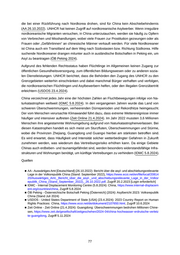 die bei einer Rückführung nach Nordkorea drohen, sind für China kein Abschiebehindernis (AA 26.10.2022). UNHCR hat keinen Zugriff auf nordkoreanische Asylwerber. Wenn irreguläre nordkoreanische Migranten versuchen, in China unterzutauchen, werden sie häufig zu Opfern von Verbrechen und Misshandlungen, wobei viele Frauen zur Prostitution gezwungen oder als Frauen oder „ Gefährtinnen“ an chinesische Männer verkauft werden. Für viele Nordkoreaner ist China auch ein Transitland auf dem Weg nach Südostasien bzw. Richtung Südkorea. Hilfe suchende Nordkoreaner drangen mitunter auch in ausländische Botschaften in Peking ein, um Asyl zu beantragen (ÖB Peking 2024). Aufgrund des fehlenden Rechtsstatus haben Flüchtlinge im Allgemeinen keinen Zugang zur öffentlichen Gesundheitsversorgung, zum öffentlichen Bildungswesen oder zu anderen sozia len Dienstleistungen. UNHCR berichtet, dass die Behörden den Zugang des UNHCR zu den Grenzgebieten weiterhin einschränken und dabei manchmal Bürger verhaften und verfolgen, die nordkoreanischen Flüchtlingen und Asylbewerbern helfen, oder den illegalen Grenzübertritt erleichtern (USDOS 23.4.2024). China verzeichnet jedes Jahr eine der höchsten Zahlen an Fluchtbewegungen infolge von Na turkatastrophen weltweit (IDMC 5.8.2024). In den vergangenen Jahren wurde das Land von schweren Überschwemmungen, verheerenden Dürreperioden und Rekordhitze heimgesucht. Der vom Menschen verursachte Klimawandel führt dazu, dass extreme Wetterereignisse immer häufiger und intensiver auftreten (Zeit Online 21.4.2024). Im Jahr 2022 mussten 3,6 Millionen Menschen ihre angestammte Wohnumgebung aufgrund von Naturkatastrophenverlassen. Bei diesen Katastrophen handelt es sich meist um Sturzfluten, Überschwemmungen und Stürme, wobei die Provinzen Zhejiang, Guangdong und Guangxi hierbei am stärksten betroffen sind. Es wird erwartet, dass Häufigkeit und Intensität solcher wetterbedingter Gefahren in Zukunft zunehmen werden, was wiederum das Vertreibungsrisiko erhöhen kann. Da einige Gebiete Chinas auch erdbeben- und tsunamigefährdet sind, werden besonders widerstandsfähige Infra strukturen und Wohnungen benötigt, um künftige Vertreibungen zu verhindern (IDMC 5.8.2024). Quellen ■ AA - Auswärtiges Amt [Deutschland] (26.10.2022): Bericht über die asyl- und abschiebungsrelevante Lage in der Volksrepublik China (Stand: September 2022), https://www.ecoi.net/en/file/local/20814 20/Auswärtiges_Amt,_Bericht_über_die_asyl-_und_abschiebungsrelevante_Lage_in_der_Volksr epublik_China_(Stand_September_2022),_26.10.2022.pdf, Zugriff 20.2.2023 [Login erforderlich] ■ IDMC - Internal Displacement Monitoring Centre (5.8.2024): China, https://www.internal-displacem ent.org/countries/china, Zugriff 5.8.2024 ■ ÖB Peking - Österreichische Botschaft Peking [Österreich] (2024): Asylbericht 2023: Volksrepublik China (Stand Juli 2024) ■ USDOS - United States Department of State [USA] (23.4.2024): 2023 Country Report on Human Rights Practices: China, https://www.ecoi.net/de/dokument/2107650.html, Zugriff 10.6.2024 ■ Zeit Online - Zeit Online (21.4.2024): Guangdong: Überschwemmungen bedrohen Millionen Chine sen, https://www.zeit.de/gesellschaft/zeitgeschehen/2024-04/china-hochwasser-erdrutsche-verletz te-guangdong, Zugriff 5.11.2024 77