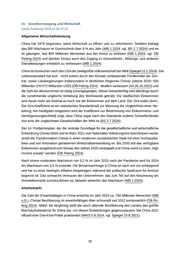 21 Grundversorgung und Wirtschaft Letzte Änderung 2024-11-28 07:24 Allgemeine Wirtschaftsleistung China hat 1978 begonnen, seine Wirtschaft zu öffnen und zu reformieren. Seitdem beträgt das BIP-Wachstum im Durchschnitt über 9 % pro Jahr (WB 1.2024; vgl. BS 2.7.2024) und es ist gelungen, fast 800 Millionen Menschen aus der Armut zu befreien (WB 1.2024; vgl. ÖB Peking 2024) und darüber hinaus auch den Zugang zu Gesundheits-, Bildungs- und anderen Dienstleistungen erheblich zu verbessern (WB 1.2024). China ist inzwischen nach den USA die zweitgrößte Volkswirtschaft der Welt (Spiegel 15.2.2024). Der Lebensstandard hat sich - nicht zuletzt durch den Einsatz umfassender Fördermittel der Zen tral- sowie Lokalregierungen insbesondere in ländlichen Regionen Chinas (alleine 2020: 500 Milliarden CNY/72 Milliarden USD) (ÖB Peking 2024) - deutlich verbessert (AA 26.10.2022) und die Zahl der absolut Armen ist stetig zurückgegangen. Dieser Gesamterfolg wird allerdings durch die zunehmende ungleiche Verteilung des Wohlstands getrübt. Die städtischen Einkommen sind heute mehr als dreimal so hoch wie die Einkommen auf dem Land. Der Gini-Index [Anm.: Der Gini-Koeffizient ist ein statistisches Standardmaß zur Messung der Ungleichheit einer Ver teilung. Am häufigsten eingesetzt wird der Koeffizient zur Bestimmung von Einkommens- und Vermögensungleichheit] zeigt, dass China sogar nach den Standards anderer Schwellenländer nun eine der ungleichsten Gesellschaften der Welt ist (BS 2.7.2024). Der 14. Fünfjahresplan, der die zentrale Grundlage für die gesellschaftliche und wirtschaftliche Entwicklung Chinas bildet und im März 2021 vom Nationalen Volkskongress beschlossen wurde, strebt die Transformation Chinas in einen modernen sozialistischen Staat mit einer hochqualita tiven und von Innovation getriebenen Wirtschaftsentwicklung an. Bis 2035 soll das verfügbare Einkommen ausgehend vom Niveau des Jahres 2020 verdoppelt und China somit zu einer „ high income society“ werden (ÖB Peking 2024). Nach einem moderaten Wachstum von 5,2 % im Jahr 2023 nach der Pandemie wird für 2024 ein Wachstum von 4,5 % erwartet. Die Binnennachfrage in China ist nach wie vor schleppend und hat zu einer niedrigen Inflation beigetragen, während der politische Spielraum für Anreize begrenzt ist. Das schwache Vertrauen der Unternehmen, das zum Teil auf den Abschwung am Immobilienmarkt zurückzuführen ist, belastet weiterhin das Wachstum (WB 1.2024). Arbeitsmarkt Die Zahl der Erwerbstätigen in China erreichte im Jahr 2023 ca. 780 Millionen Menschen (WB o.D.). Chinas Bevölkerung im erwerbsfähigen Alter schrumpft seit 2012 kontinuierlich (ÖB Pe king 2024). Mittel- bis langfristig stellt die rasch alternde Bevölkerung des Landes das größte Wachstumshindernis für China dar. Um diesen Entwicklungen gegenzusteuern, hat China 2021 offiziell eine Drei-Kind-Politik proklamiert (WKO 5.8.2024; vgl. Spiegel 23.8.2021). 78