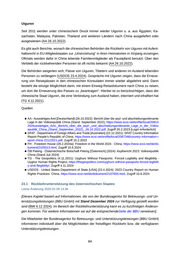 Uiguren Seit 2011 werden unter chinesischem Druck immer wieder Uiguren u. a. aus Ägypten, Ka sachstan, Malaysia, Pakistan, Thailand und weiteren Ländern nach China ausgeliefert oder ausgewiesen (AA 26.10.2022). Es gibt auch Berichte, wonach die chinesischen Behörden die Rückkehr von Uiguren mit Aufent haltsrecht in EU-Mitgliedstaaten zur „ Umerziehung“ in ihren Heimatorten in Xinjiang erzwingen. Oftmals werden dafür in China lebende Familienmitglieder als Faustpfand benutzt. Über den Verbleib der rückkehrenden Personen ist oft nichts bekannt (AA 26.10.2022). Die Behörden weigerten sich, Pässe von Uiguren, Tibetern und anderen im Ausland lebenden Personen zu verlängern (USDOS 23.4.2024). Gespräche mit Uiguren zeigen, dass die Erneue rung von Reisepässen in den chinesischen Konsulaten immer wieder abgelehnt wird. Dann besteht die einzige Möglichkeit darin, mit einem Einweg-Reisedokument nach China zu reisen, um dort die Erneuerung des Passes zu „ beantragen“. Hierbei ist zu berücksichtigen, dass der chinesische Staat Uiguren, die eine Verbindung zum Ausland haben, interniert und inhaftiert hat (TG 4.11.2021). Quellen ■ AA - Auswärtiges Amt [Deutschland] (26.10.2022): Bericht über die asyl- und abschiebungsrelevante Lage in der Volksrepublik China (Stand: September 2022), https://www.ecoi.net/en/file/local/20814 20/Auswärtiges_Amt,_Bericht_über_die_asyl-_und_abschiebungsrelevante_Lage_in_der_Volksr epublik_China_(Stand_September_2022),_26.10.2022.pdf, Zugriff 20.2.2023 [Login erforderlich] ■ DFAT - Department of Foreign Affairs and Trade [Australien] (22.12.2021): DFAT Country Information Report People’s Republic of China, https://www.ecoi.net/en/file/local/2067346/country-information-r eport-china-22122021.pdf, Zugriff 15.2.2023 ■ FH - Freedom House (29.2.2024a): Freedom in the World 2024 - China, https://www.ecoi.net/de/do kument/2105013.html, Zugriff 10.6.2024 ■ ÖB Peking - Österreichische Botschaft Peking [Österreich] (2024): Asylbericht 2023: Volksrepublik China (Stand Juli 2024) ■ TG - The Geopolitics (4.11.2021): Uyghurs Without Passports: Forced Legibility and Illegibility - Uyghur Human Rights Project, https://thegeopolitics.com/uyghurs-without-passports-forced-legibilit y-and-illegibility/, Zugriff 4.11.2024 ■ USDOS - United States Department of State [USA] (23.4.2024): 2023 Country Report on Human Rights Practices: China, https://www.ecoi.net/de/dokument/2107650.html, Zugriff 10.6.2024 23.1 Rückkehrunterstützung des österreichischen Staates Letzte Änderung 2025-01-09 14:36 [Dieses Kapitel basiert auf Informationen, die von der Bundesagentur für Betreuungs- und Un terstützungsleistungen (BBU GmbH) mit Stand Dezember 2024 zur Verfügung gestellt worden sind (BMI 6.12.2024). Im Bereich der Rückkehrunterstützung kann es zu kurzfristigen Änderun gen kommen. Für weitere Informationen sei auf die entsprechendeSeite der BBU verwiesen]. Die Mitarbeiter der Bundesagentur für Betreuungs- und Unterstützungsleistungen (BBU GmbH) informieren individuell über die Möglichkeiten der freiwilligen Rückkehr bzw. die verfügbaren Unterstützungsleistungen. 84