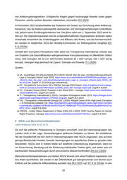 von Antikorruptionsgesetzen. Erfolgreiche Klagen gegen hochrangige Beamte sowie gegen Personen, welche solchen Beamten nahestehen, sind selten (FH 2024). Im November 2022 verabschiedete das Parlament ein Gesetz zur Einrichtung eines Antikorrup tionsbüros, das die Antikorruptionspolitik überwachen und Vermögenserklärungen kontrollieren soll, jedoch keine Ermittlungsfunktionen hat. Das Büro nahm am 1. September 2023 seine Ar beit auf. Die Oppositionsparteien und die zivilgesellschaftlichen Organisationen äußerten starke Vorbehalte hinsichtlich der Unabhängigkeit und Effizienz des Amtes, und die Rechtsvorschrif ten wurden im September 2023 der Venedig-Kommission zur Stellungnahme vorgelegt (EC 8.11.2023a). Gemäß dem Corruption Perceptions Index 2023 von Transparency International, welcher das von Experten und Geschäftsleuten wahrgenommene Korruptionsniveau im öffentlichen Sektor misst, wird Georgien mit 53 von 100 Punkten bewertet (0 = sehr korrupt, 100 = sehr wenig korrupt). Georgien liegt gleichauf mit Zypern, Grenada und Ruanda (TI 1.2024). Quellen ■ AA - Auswärtiges Amt [Deutschland] (26.5.2023): Bericht über die asyl- und abschiebungsrelevante Lage in Georgien (Stand: April 2023), https://www.ecoi.net/en/file/local/2092800/Auswärtiges_Amt, _Bericht_über_die_asyl-_und_abschiebungsrelevante_Lage_in_Georgien_(Stand_April_2023),_26. 05.2023.pdf, Zugriff 17.10.2024 [Login erforderlich] ■ EC - Europäische Kommission (8.11.2023a): Georgia 2023 Report, https://neighbourhood-enlarge ment.ec.europa.eu/system/files/2023-11/SWD_2023_697 Georgia report.pdf, Zugriff 4.9.2024 ■ FH - Freedom House (2024): Freedom in the World 2024 - Georgia, https://www.ecoi.net/de/doku ment/2108040.html, Zugriff 14.8.2024 ■ TI - Transparency International (1.2024): Corruption Perceptions Index 2023, https://images.trans parencycdn.org/images/Report_CPI2023_Eng.pdf, Zugriff 15.5.2024 ■ TIG - Transparency International Georgia (26.1.2024): Alleged Cases of the High-Level Corruption — A Periodically Updated List, https://transparency.ge/en/blog/alleged-cases-high-level-corruptio n-periodically-updated-list?fbclid=IwAR2X5ojLHC-llutfBeQ9ZTFiGr1I5yRUzkaHy3upB6KA3mGYoz BtOZ_iPms, Zugriff 9.9.2024 ■ USDOS - United States Department of State [USA] (23.4.2024): 2023 Country Report on Human Rights Practices: Georgia, https://www.ecoi.net/de/dokument/2107700.html, Zugriff 2.9.2024 8 NGOs und Menschenrechtsaktivisten Letzte Änderung 2024-10-25 14:18 Da sich die politische Polarisierung in Georgien verschärft, sind die Interessengruppen des Landes nicht in der Lage, themenbezogene politische Debatten zu führen. Ein erheblicher Teil der Gesellschaft hat sich nicht in Interessengruppen oder NGOs organisiert, was auf eine geringe Bereitschaft hinweist, formelle Vereinigungen mit spezifischen Zielen zu gründen oder beizutreten. NGOs sind in hohem Maße auf westliche Unterstützung angewiesen, wenn es um Finanzierung, Beratung und die Förderung individueller Freiheit geht, und sehen sich mit wachsenden Herausforderungen durch prorussische Akteure konfrontiert (BS 19.3.2024). Menschenrechtsorganisationen und andere NGOs können sich ohne Probleme registrieren und ihre Arbeit durchführen. Sie werden in der Öffentlichkeit gut wahrgenommen und können auch Einfluss auf die politische Willensbildung ausüben (AA 26.5.2023; vgl. EC 8.11.2023a). In den 19