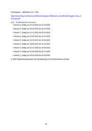 Amtssignatur – Bildmarke (117,7 KB) https://www.bfa.gv.at/Impressum/files/Amtssignatur-Bildmarke_Veroeffentlichungstext-Neu_2 023_sgn.pdf 24.3 Veröffentlichte Versionen • Version 9, Gültig von 25-10-2024 bis 07-02-2025 • Version 8, Gültig von 03-10-2023 bis 25-10-2024 • Version 7, Gültig von 13-12-2022 bis 03-10-2023 • Version 6, Gültig von 22-03-2022 bis 13-12-2022 • Version 5, Gültig von 15-10-2021 bis 22-03-2022 • Version 4, Gültig von 29-03-2021 bis 15-10-2021 • Version 3, Gültig von 02-12-2020 bis 29-03-2021 • Version 2, Gültig von 02-09-2020 bis 02-12-2020 • Version 1, Gültig von 09-04-2020 bis 02-09-2020 © 2025 Staatendokumentation des Bundesamtes für Fremdenwesen und Asyl 53