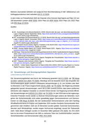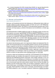 Mehrere Journalisten befinden sich aufgrund ihrer Berichterstattung in Haft. Selbstzensur und Auftragsjournalismus sind verbreitet (AA 21.12.2023). In dem Index zur Pressefreiheit 2025 der Reporter ohne Grenzen liegt Nigeria auf Platz 122 von 180 bewerteten Ländern (RSF 2025); 2024: Platz 112 (RSF 2024); 2023: Platz 123; 2022: Platz 129 (ÖB Abuja 10.2024). Quellen ■ AA - Auswärtiges Amt [Deutschland] (8.1.2025): Bericht über die asyl- und abschiebungsrelevante Lage in Nigeria (Stand: September 2024), https://milo.bamf.de/OTCS/cs.exe/app/nodes/30496494, Zugriff 23.5.2025 [Login erforderlich] ■ AA - Auswärtiges Amt [Deutschland] (21.12.2023): Bericht über die asyl- und abschiebungsrelevante Lage in Nigeria (Stand: November 2023), https://www.ecoi.net/en/file/local/2102769/Auswärtige s_Amt,_Bericht_über_die_asyl-_und_abschiebungsrelevante_Lage_in_Nigeria,_21.12.2023.pdf , Zugriff 27.5.2024 [Login erforderlich] ■ FH - Freedom House (2025): Nigeria: Freedom in the World 2025, https://freedomhouse.org/count ry/nigeria/freedom-world/2025, Zugriff 12.5.2025 ■ HRW - Human Rights Watch (16.1.2025): World Report 2025 - Nigeria, https://www.ecoi.net/de/do kument/2120043.html, Zugriff 20.1.2025 ■ ÖB Abuja - Österreichische Botschaft Abuja [Österreich] (10.2024): Asylländerbericht Nigeria Oktober 2024, https://www.ecoi.net/en/file/local/2116558/NIGR_ÖB-Bericht_2024_10.docx , Zugriff 24.10.2024 [Login erforderlich] ■ RSF - Reporter ohne Grenzen (2025): Nigeria: Rangliste der Pressefreiheit, https://www.reporter-o hne-grenzen.de/nigeria, Zugriff 3.6.2025 ■ RSF - Reporter ohne Grenzen (2024): Nigeria - Rangliste der Pressefreiheit, https://www.reporter-o hne-grenzen.de/nigeria, Zugriff 14.6.2024 ■ USDOS - United States Department of State [USA] (23.4.2024): 2023 Country Report on Human Rights Practices: Nigeria, https://www.ecoi.net/de/dokument/2107771.html, Zugriff 3.6.2024 13 Versammlungs- und Vereinigungsfreiheit, Opposition Letzte Änderung 2025-08-08 07:17 Die Versammlungsfreiheit wird durch die Verfassung garantiert (AA 8.1.2025; vgl. ÖB Abuja 10.2024, USDOS 23.4.2024, FH 2025). Allerdings wird sie bisweilen durch das Eingreifen der Sicherheitsorgane gegen politisch unliebsame Versammlungen (z. B. von Schiiten oder Biaf ra-Aktivisten) in der Praxis eingeschränkt (AA 8.1.2025; vgl. FH 2025). Die Regierung verbietet gelegentlich gezielt Versammlungen, wenn sie zu dem Schluss kommt, dass deren politischer, ethnischer oder religiöser Charakter zu Unruhen führen könnte. Die Regierung schränkt öffentli che Versammlungen ein (USDOS 23.4.2024; vgl. FH 2025). Im Jahr 2024 kam es bei regierungs kritischen Protesten immer wieder zu diversen Einschränkungen seitens der Behörden. Auch gehen die Sicherheitskräfte nicht selten gewalttätig gegen Demonstrantinnen und Demons tranten vor (ÖB Abuja 10.2024). Bei den landesweiten Demonstrationen unter dem Hashtag #EndBadGovernance im August und September 2024 wurden Hunderte Demonstranten fest genommen oder inhaftiert, mehr als 20 Menschen wurden getötet. Dutzende Demonstranten, darunter auch Minderjährige, wurden wegen Hochverrats angeklagt, worauf die Todesstrafe steht. Viele dieser Anklagen wurden im November fallen gelassen (FH 2025). Am 29.3.2024 kam es bei einem Protestmarsch der IMN zu mehreren Toten bei Zusammenstößen zwischen Sicherheitskräften und Demonstranten (REU 29.3.2025). 33