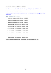 Hinweise für elektronische Anbringen (96,7 KB) https://www.bfa.gv.at/Kontakt/files/Kundmachung_nach_13_Abs_2_und_5_AVG.pdf Amtssignatur – Bildmarke (117,7 KB) https://www.bfa.gv.at/Impressum/files/Amtssignatur-Bildmarke_Veroeffentlichungstext-Neu_2 023_sgn.pdf 25.3 Veröffentlichte Versionen • Version 12, Gültig von 31-01-2025 bis 08-08-2025 • Version 11, Gültig von 16-08-2024 bis 31-01-2025 • Version 10, Gültig von 22-11-2023 bis 16-08-2024 • Version 9, Gültig von 05-07-2023 bis 22-11-2023 • Version 8, Gültig von 26-01-2023 bis 05-07-2023 • Version 7, Gültig von 16-11-2022 bis 26-01-2023 • Version 6, Gültig von 29-07-2022 bis 16-11-2022 • Version 5, Gültig von 31-05-2022 bis 29-07-2022 • Version 4, Gültig von 31-01-2022 bis 31-05-2022 • Version 3, Gültig von 03-09-2021 bis 31-01-2022 © 2025 Staatendokumentation des Bundesamtes für Fremdenwesen und Asyl 86