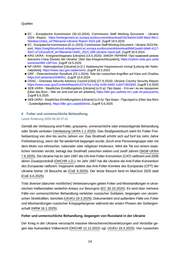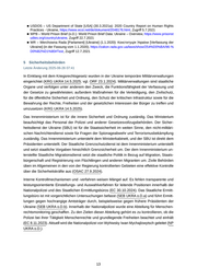 Quellen ■ EC - Europäische Kommission (30.10.2024): Commission Staff Working Document - Ukraine 2024 Report, https://enlargement.ec.europa.eu/document/download/1924a044-b30f-48a2-99c1- 50edeac14da1_en?filename=Ukraine Report 2024.pdf, Zugriff 19.5.2025 ■ EC - Europäische Kommission (8.11.2023): Commission Staff Working Document - Ukraine 2023 Re port, https://neighbourhood-enlargement.ec.europa.eu/document/download/bb61ea6d-dda6-4117- 9347-a7191ecefc3f_en?filename=SWD_2023_699 Ukraine report.pdf, Zugriff 20.6.2024 ■ KRG UKRA - Kriegsrechtsgesetz [Ukraine] (14.5.2025): ЗАКОН УКРАЇНИ: Про правовий режим воєнного стану [Gesetz der Ukraine: Über das Kriegsrechtssystem], https://zakon.rada.gov.ua/la ws/show/389-19#Text, Zugriff 19.5.2025 ■ NP UKRA - Nationalpolizei [Ukraine] (o.D.): Керівництво Національної поліції [Leitung der Natio nalpolizei], https://www.npu.gov.ua/persons, Zugriff 19.5.2025 ■ ORF - Österreichischer Rundfunk (23.1.2024): Tote bei russischen Angriffen auf Kiew und Charkiw, https://orf.at/stories/3346501, Zugriff 10.6.2024 ■ OSAC - Overseas Security Advisory Council [USA] (27.9.2024): Ukraine Country Security Report, https://www.osac.gov/Content/Report/c227e7ce-c15a-4160-b0d3-1cb077d02830 , Zugriff 2.6.2025 ■ SEB UKRA - Staatliches Ermittlungsbüro [Ukraine] (o.D.a): Про Бюро - Хто ми і як ми працюємо [Über das Büro – Wer wir sind und wie wir arbeiten], https://dbr.gov.ua/khto-mi-i-yak-mi-pracyuemo , Zugriff 5.6.2025 ■ SEB UKRA - Staatliches Ermittlungsbüro [Ukraine] (o.D.b): Про Бюро - Підслідність [Über das Büro - Zuständigkeiten], https://dbr.gov.ua/pidslidnist, Zugriff 5.6.2025 6 Folter und unmenschliche Behandlung Letzte Änderung 2025-06-26 07:41 Gemäß der Verfassung sind Folter, grausame, unmenschliche oder entwürdigende Behandlung oder Strafe verboten (Verfassung UKRA 1.1.2020). Das Strafgesetzbuch sieht für Folter Frei heitsentzug von drei bis sechs Jahren vor. Das Strafmaß erhöht sich auf fünf bis zehn Jahre Freiheitsentzug, wenn die Tat wiederholt begangen wurde, durch eine Personengruppe oder mit dem Motiv von ethnischer, nationaler oder religiöser Intoleranz. Wird die Tat von einem staat lichen Vertreter verübt, beträgt das Strafmaß zwischen sieben und zwölf Jahren (StGB UKRA 7.6.2025). Die Ukraine hat im Jahr 1987 die UN-Anti-Folter-Konvention (CAT) ratifiziert und 2006 deren Zusatzprotokoll (OHCHR o.D.). Im Jahr 1997 hat die Ukraine die Anti-Folter-Konvention des Europarats ratifiziert. Insgesamt stattete das Anti-Folter-Komitee des Europarats (CPT) der Ukraine bisher 18 Besuche ab (CoE 6.2025). Der letzte Besuch fand im Mai/Juni 2025 statt (CoE 6.6.2025). Trotz diverser (darunter rechtlicher) Verbesserungen geben Folter und Misshandlungen in ukrai nischen Haftanstalten weiterhin Anlass zur Besorgnis (EC 30.10.2024). Es wird über mehrere Fälle von unmenschlicher Behandlung verletzter russischer Soldaten, begangen von ukraini schen Streitkräften, berichtet (UIUKU 19.3.2025). Dokumentiert sind außerdem Fälle von Folter und Misshandlungen russischer Kriegsgefangener während der ersten Phasen der Gefangen schaft (HRW 16.1.2025). Folter und unmenschliche Behandlung, begangen von Russland in der Ukraine Der Krieg in der Ukraine verursacht massive Menschenrechtsverletzungen und Verstöße ge gen das humanitäre Völkerrecht (OHCHR 12.12.2023; vgl. UIUKU 19.3.2025). Von russischen 14